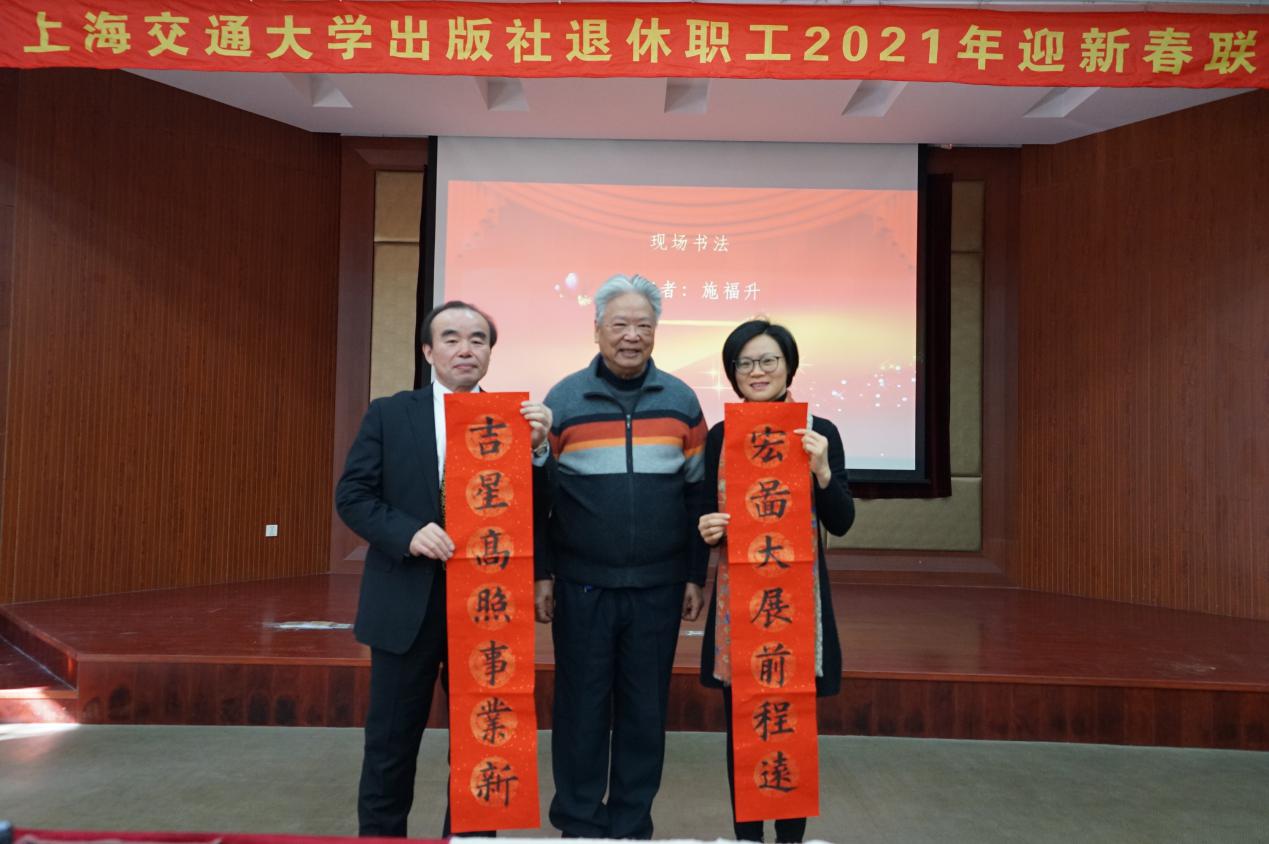 有了音樂(lè)還不夠,書(shū)法藝術(shù)也美妙。施福升帶來(lái)了現(xiàn)場(chǎng)書(shū)法表演,并向出版社贈(zèng)送了春聯(lián)——“宏圖大展前程遠(yuǎn),吉星高照事業(yè)新”,字字飽含著對(duì)出版社的深深祝福。