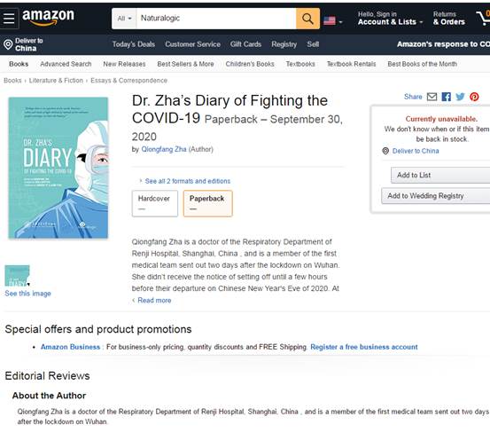 圖為《查醫(yī)生援鄂日記》英文版亞馬遜預(yù)售頁面