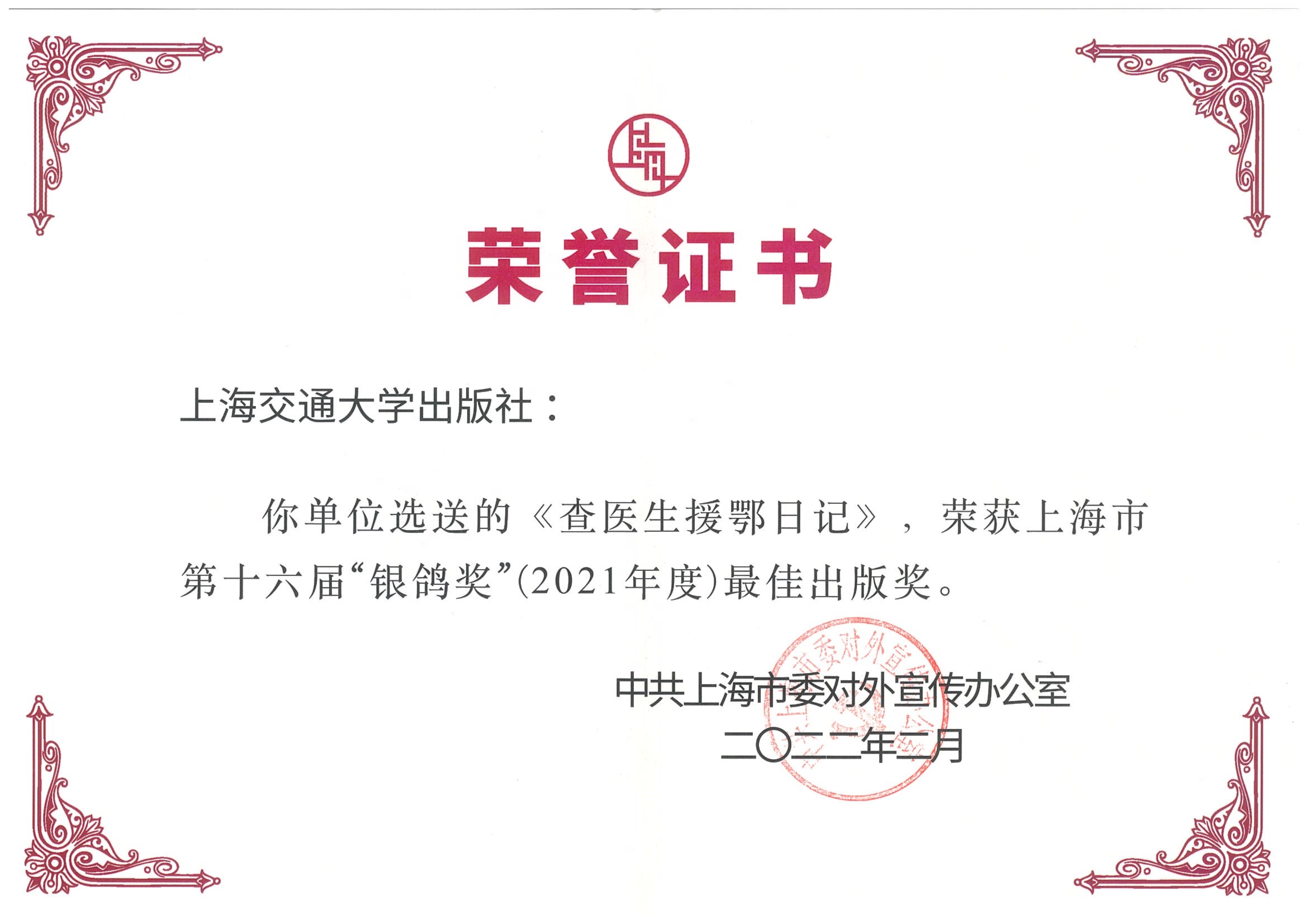 近日,由中共上海市委對外宣傳辦公室主辦的上海市第十六屆“銀鴿獎(jiǎng)”評選活動(dòng)結(jié)果揭曉。此次評選活動(dòng)共有214件作品入選本屆“銀鴿獎(jiǎng)”,其中出版類51件。我社《查醫(yī)生援鄂日記》榮獲第十六屆“銀鴿獎(jiǎng)”最佳出版獎(jiǎng)?!断窭C花一樣精細(xì):城市治理的徐匯實(shí)踐》榮獲第十六屆“銀鴿獎(jiǎng)”優(yōu)勝獎(jiǎng)。