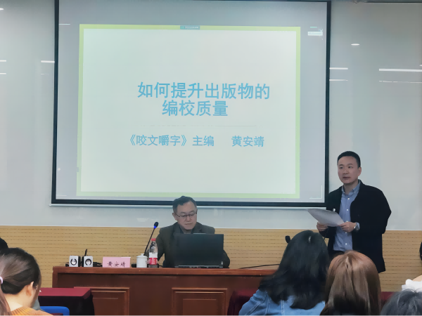 4月30日下午,出版社2024年第1期“精業(yè)論壇”在物資樓一樓會(huì)議室精彩開講。為進(jìn)一步提升我社出版物編校質(zhì)量,培養(yǎng)編輯對(duì)書稿中差錯(cuò)的糾錯(cuò)能力,出版社特別邀請(qǐng)《咬文嚼字》主編黃安靖作“如何提升出版物的編校質(zhì)量”專題講座。講座由出版社社長(zhǎng)、總編輯陳華棟主持,各分社、部門共計(jì)70余人參加了本次講座。