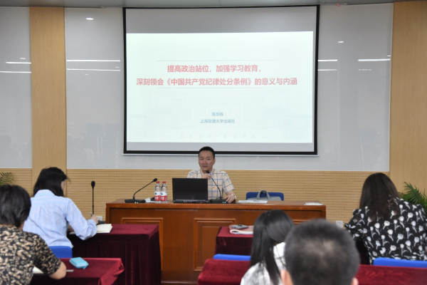 為落實學校關(guān)于深入開展黨紀學習教育的部署要求,按照出版社黨委工作安排,6月11日上午,出版社黨委副書記、社長、總編輯陳華棟以《提高政治站位,加強學習教育,深刻領會〈中國共產(chǎn)黨紀律處分條例〉的意義與內(nèi)涵》為題、財務總監(jiān)周洋以《〈中國共產(chǎn)黨紀律處分條例〉——違反群眾紀律的解讀》為題、第一黨支部書記錢方針以《以紀律為綱 為出版系扣》為題講授了專題黨課。本次黨課由錢方針主持,第一黨支部全體黨員、聯(lián)系黨小組、入黨積極分子等40余人參加學習。