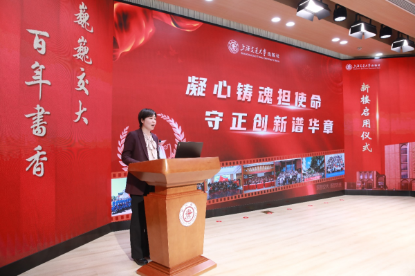 隨后,學(xué)?;ㄌ幭虺霭嫔缃桓缎聵?,徐放、王光艷、陳華棟以及原領(lǐng)導(dǎo)施福升、錢天東、韓建民、劉佩英、李芳、李廣良共同見證新樓交付使用。隨著卷軸徐徐展開,出版社新樓正式啟用。