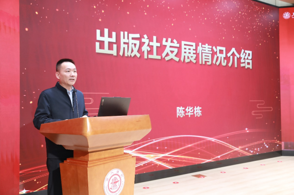 出版社黨委副書記、社長(zhǎng)、總編輯陳華棟代表社班子介紹出版社發(fā)展情況。他從出版社歷史溯源娓娓道來(lái),談及業(yè)務(wù)經(jīng)營(yíng)工作亮點(diǎn),并重點(diǎn)講述了2022年6月至今辦公樓大修的工作歷程,多方位展現(xiàn)了出版社在服務(wù)支撐學(xué)校、深耕出版行業(yè)、提升綜合實(shí)力、擴(kuò)大社會(huì)影響力等方面的孜孜追求和不懈探索。借此機(jī)會(huì),他向?qū)W校黨委,以及關(guān)心支持出版社事業(yè)發(fā)展的各級(jí)領(lǐng)導(dǎo)和同仁,表達(dá)了誠(chéng)摯的敬意和感謝。