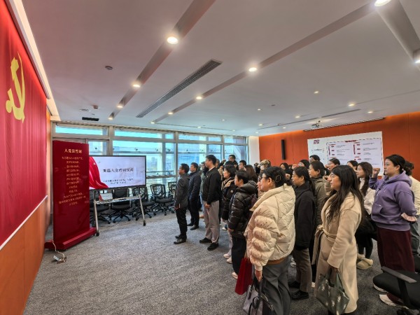 10時30分,全體黨員來到位于西岸智塔5樓的徐匯濱江數(shù)字谷黨群活動中心,該中心采用“視覺引導(dǎo)+全員參與+沉浸式體驗”的方式開展可視化體驗式黨課,讓黨員教育更生動。中心定期開展“初心講述人”特色品牌活動,邀請青年黨員分享創(chuàng)業(yè)初心故事。此外,該中心結(jié)合區(qū)域內(nèi)外資企業(yè)、民營企業(yè)集中的特點,設(shè)立了“樓智匯”議事平臺,該平臺是白領(lǐng)反映問題、提出建議的重要渠道。通過該平臺,白領(lǐng)的共性需求和合理建議能得到及時響應(yīng)和有效解決,并孕育出種菜社、桌游社等八大“白領(lǐng)社團”。通過講解員對這些生動案例的介紹,大家紛紛表示原來黨建工作也可以這么做,也可以做得這么生動實用。隨后,全體黨員齊聚組織生活室,新轉(zhuǎn)正黨員郭嘉泰與其他黨員在黨委副書記、紀委書記戴智華同志的帶領(lǐng)下,面向黨旗莊重宣誓,重溫入黨誓詞。鏗鏘有力的誓言在現(xiàn)場回蕩,既彰顯了新黨員的初心與使命,更凝聚起全體黨員奮勇前行的力量,激勵著大家以實際行動詮釋黨員的使命與擔當。