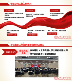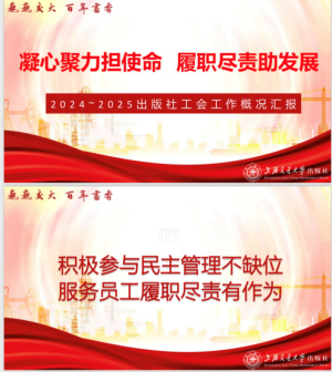 本次工會考評分為自評和集中匯報評審兩個階段。為做好本次考核評比工作,在出版社黨委指導(dǎo)下,工會委員會委員宗德寶、鄭月林、張文靜、耿爽、蔣英多次召開會議,對照匯報材料逐一進行準(zhǔn)備落實。各位委員精心準(zhǔn)備相關(guān)臺賬。匯報ppt由鄭月林、張文靜兩位委員反復(fù)修改,力爭全面反映出版社工會在過去兩年來的特色工作和全社員工奮發(fā)向上的精神面貌。