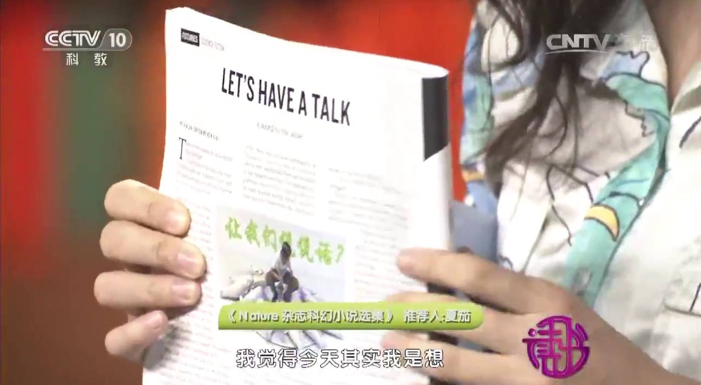 所以在這個(gè)故事的結(jié)尾,這個(gè)語言學(xué)家,他就成為了第一個(gè)去跟這些小海豹說話的人類。那在我的故事里,其實(shí)這個(gè)語言學(xué)家她是一個(gè)從中國(guó)來的一位女性的學(xué)者。所以她去跟這些海豹說話的時(shí)候,她第一句話,她打招呼用的是她的母語,是用中文說的。她說:“你好,讓我們說說話。”那么這些我當(dāng)時(shí)寫的時(shí)候,也是用中文來寫這兩個(gè)句子,而且“未來專欄”的編輯,他們也就把這個(gè)原版印在了上面。所以大家可以看到這個(gè)圖里邊它里面印了一行中文,就是“讓我們說說話”。所以這個(gè)小說發(fā)表之后,我的一個(gè)朋友就開玩笑說,這有可能是《Nature》歷史上第一次刊登出來中文。